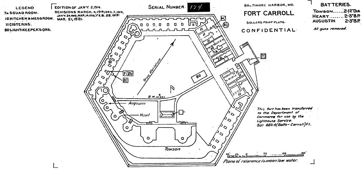 Built along Fort Carroll's south-facing walls were the casemate-displacing Battery Towson, named for Nathan Towson of the US Army, who served in the War of 1812 and Mexican-American War, mounting two 12" rifles on barbette (fancy word for "sits fetchingly atop everything") carriages; Battery Heart, named for Major Jonathan Heart, 2nd US Infantry, who served in the Revolutionary War and was killed by injuns in Ohio in 1791, had two 5" rifles on balanced pillar mounts; and Battery Augustin, named for Second Lieutenant Joseph Augustin, jr., who died at the hands of the wicked Spanish in the Battle of San Juan, Cuba, in 1898, which sported a pair of 3" rifles on masking parapet mounts. Thanks to these upgrades to Fort Carroll, along with a series of new batteries on the shores of the Patapsco of which we will learn shortly, Baltimore felt pretty good about its chances against an erstwhile seaborne invader for the first couple of decades of the 20th century. Fort Carroll was not granted its own dedicated garrison during this period, but was manned by a detachment from Fort McHenry. The First World War (1914-1918) gave everyone another case of the invasion jitters, but once it became plain that the German Navy would not be sailing up the Patapsco or any other waterway in the western hemisphere, the United States felt compelled to remove the majority of the enormous gun tubes that it had so expensively and recently installed to guard its shores and...send them places. Many went to France, where they were dumped unceremoniously ashore, surely impressing all of Europe with America's ability to produce, and then discard, large expensive objects. Few if any of these guns ever made it to where they could be used for their intended purpose, unless the purpose for all of this had been to declaw virtually all of America's seacoast defenses. |