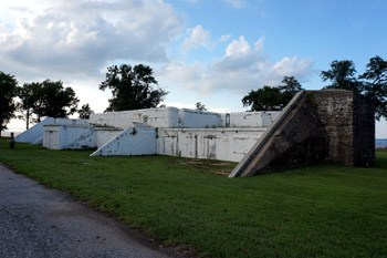 While the improvements made during the Endicott Period were somewhat at odds with America's pre-existing constellation of starforts, many of the strategic points that needed defending at the end of the 19th century were the same as they had been at the beginning of the 19th century, so many an American starfort was the beneficiary of a brand-new hideous concrete gun battery or two! While this modernization process certainly uglified a number of lovely starforts, it also probably saved those starforts, by making them part of America's seacoast defense system into the 20th century. The upshot of this was, Fort Carroll was semi-dragged into the modern age with the addition of three Endicott Batteries, built from 1898 to 1900! |