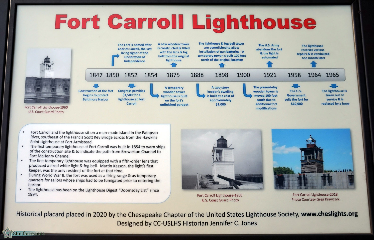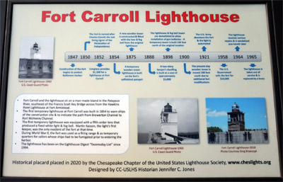 Everything you might wish to know about Fort Carroll's series of ill-fated lighthouses, from a sign at Fort Smallwood, on the western bank of the Patapsco. |