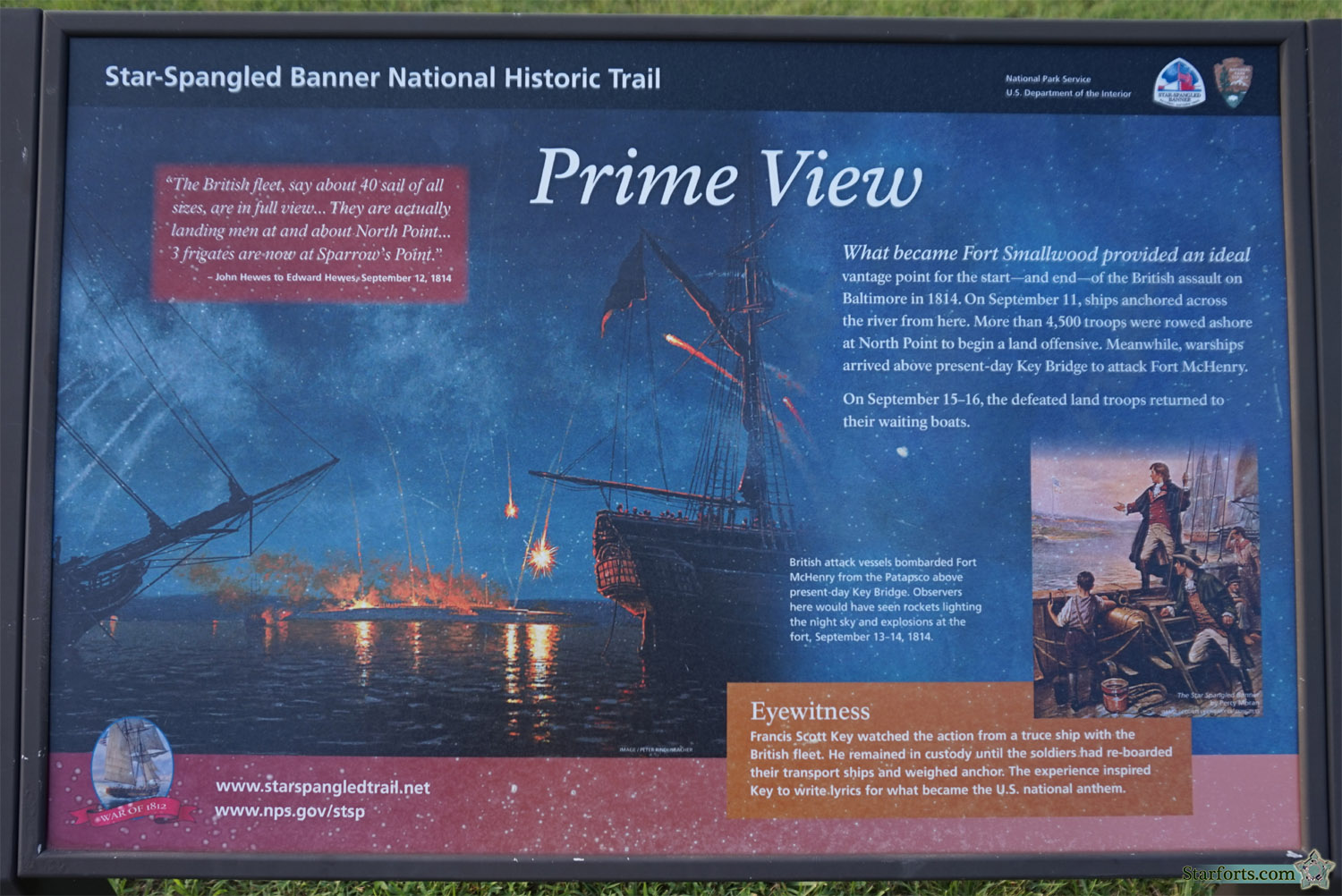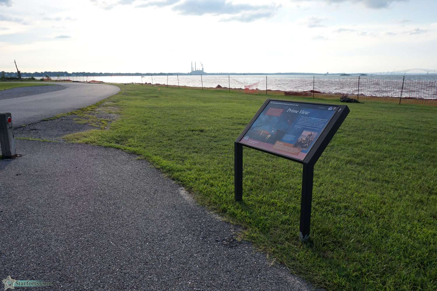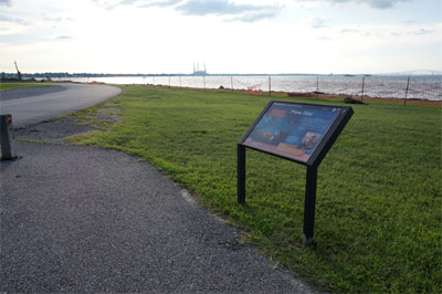 The lovely vista available at what would become Fort Smallwood made it the perfect place to watch the rockets glaring redly o'er Fort McHenry in September of 1814, when the Royal Navy was shooting at it. The sign in the foreground tells the tale. |