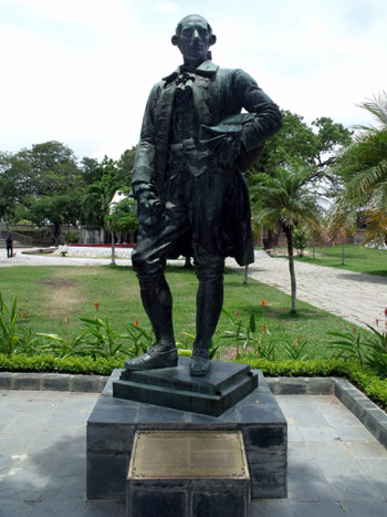 Francis Light, as he appears today at the fort. When this statue was cast in 1936, Francis had a sword on his hip. The Japanese wrenched it off during the Second World War, apparently unwilling to leave even a single Englishman in Malaysia armed. |