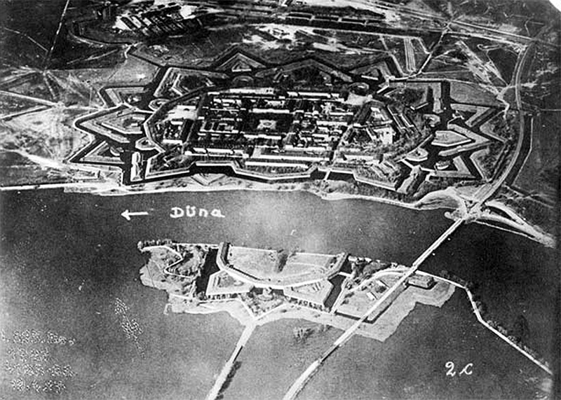 Across the Daugava River from the main fort is the Griva Bridgehead. At one point this pontoon bridge was assumedly one of the main entrances into Daugavpils Fortress, which demanded its own two dedicated bastions! The black & white image is an aerial photograph taken during the First World War: Note how the Griva Bridgehead is its own island! The Daugava River is a floody one. |