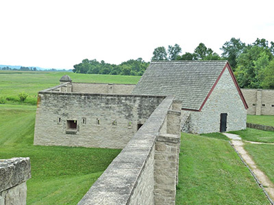 US State Governors were given some say as to what construction projects would be undertaken in their states, and in at least two cases, starfort reconstruction was the result: Fort Frederick in Maryland was another beneficiary of the WPA. Through the 1930's, Fort de Chartres' gateway, two stone interior structures and a bake oven were built atop the remains of fort Version 3.0. The fort's walls were partially rebuilt in 1989, and the frames of more interior buildings were added, atop their original foundations. Today Fort de Chartres houses a museum and a gift shop, and every June a Rendezvous, a celebration of frontier French and Indian culture, is held at the fort...and April brings the annual Fort de Chartres Colonial Trade Faire, Musket and Rifle Frolic. The Mississippi is mostly tamed by modern levees, but a flood in 1993 breached those levees, and river water yet again lapped at the walls of Fort de Chartres. You would think someone would have gotten the hint by now, and built their starfort in the Rocky Mountains instead.