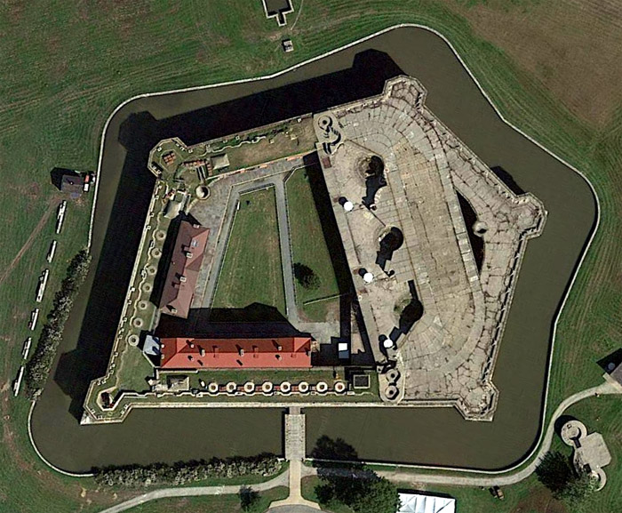 | The three intended incarnations of Fort Delaware: The original lovely star design, the weird big thing, and the polygonal wonder that it is today. |