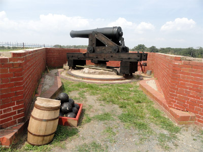 Fort Delaware has lots of guns still mounted. Here on the fort's most heroic bastion, the northwest, sits an 8-inch Columbiad gun that is fired daily, just to keep New Jersey from getting any ideas. |