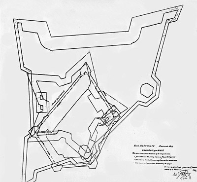 A huge triangular monstrosity fort was designed (slightly reminiscent of Fort Caroline at Jacksonville, Florida, but nowhere near as pretty), but legal battles regarding the island's legal ownership (Dr. Gales strikes back!) kept anything past foundations from being built for over 10 years.