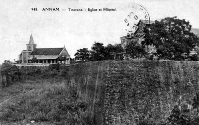 A postcard from sometime when there were both photography and postcards: Tourane - Church and Hospital. The French curled their collective lip at the though of using this faux starfort for actual defensive purposes, so they used it for other things. |