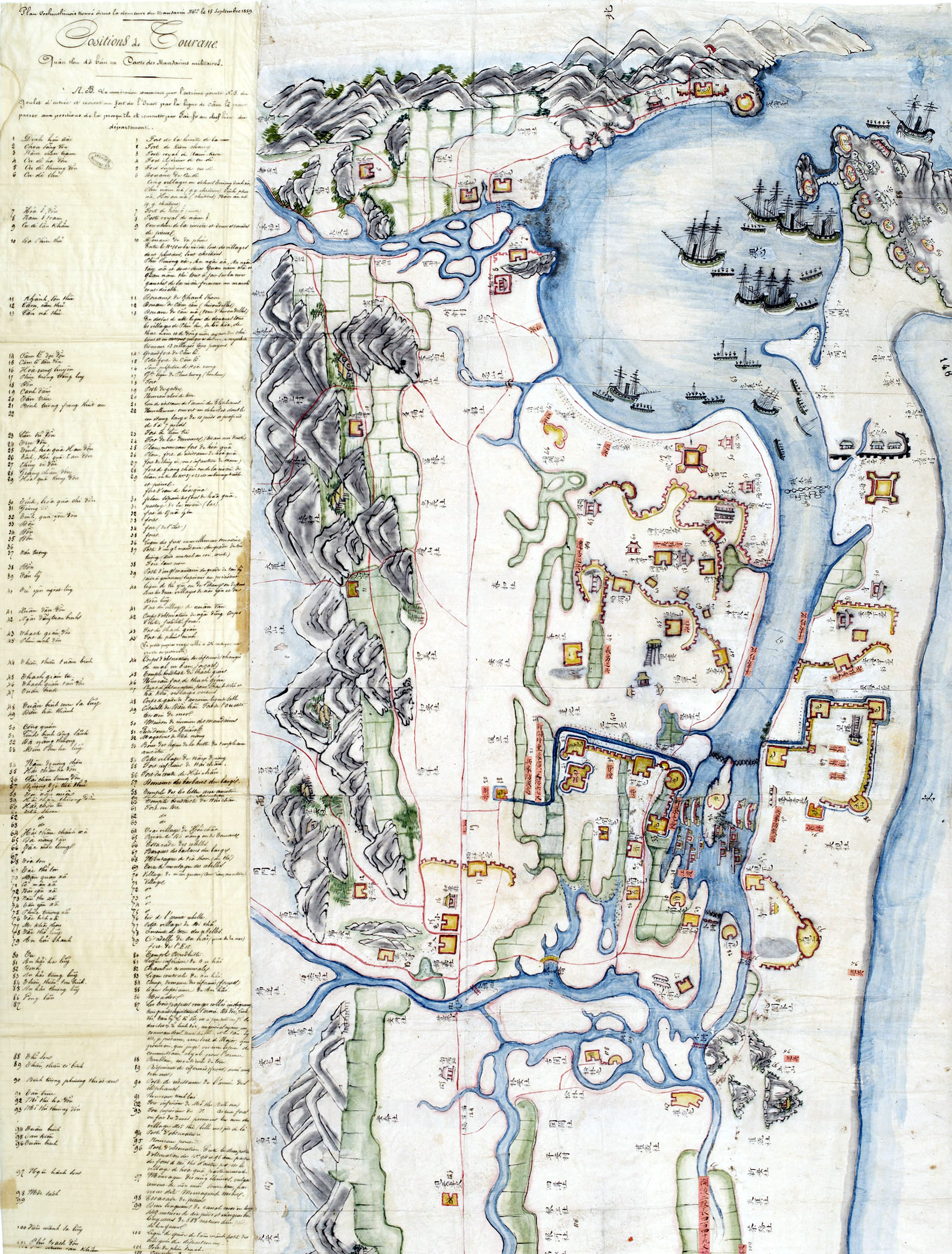 In 1813, Vietnam's Nguyen Dynasty's first Emperor Gia Long (1762-1820) ordered that the mouth of the Han River at the important seaport of Da Nang be fortified. Some manner of fortification was duly constructed on both banks of the river: We can rest assured that these were no starforts, but they were named Dien Hai Fortress and An Hai Fortress. |