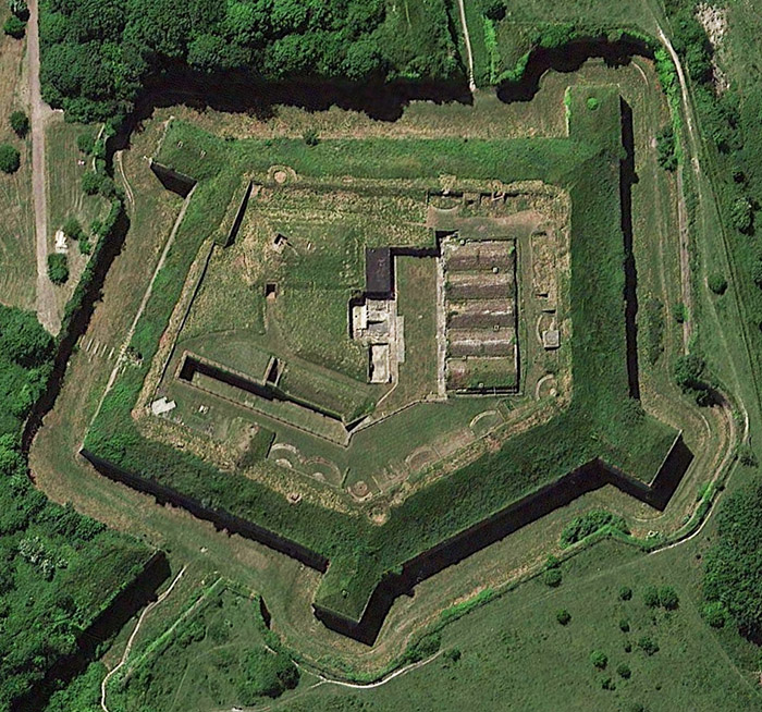 To their credit, the British were still thinking about Dover's defenses, even if they weren't actively digging. Sir Thomas Hyde Page (1746-1821), a military engineer and cartographer who had been wounded at the Battle of Bunker Hill (June 17, 1775), designed Drop Redoubt in 1784. Page's plan, for a fort that was initially named the Eastern Redoubt, called for a pentagonal structure dug into the ground with a surrounding dry moat.