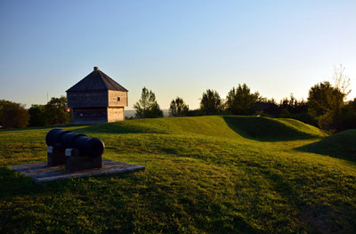 All of which context is fascinating, but perhaps we now might cast our gaze to a hill overlooking the confluence of the Avon and St. Croix Rivers, northwest of Halifax...at a little Acadian settlement called Pisiquid. Were *I* someone commanding a military force interested in relieving the British of Halifax in the mid-18th century, I would definitely consider the route up the Bay of Fundy, down the Avon and then overland about 30 miles to Halifax's potentially underdefended back door. The British could read maps too, and identified this hill where the Avon and St. Croix meet as a great place for a starfort...and that lots of Acadians lived around this area only served to make it a more attractive spot for the projection of British power. Or more specifically, a blockhouse! Often the starting point for a more serious fortification, a blockhouse was (and in some cases still is) a stout wooden structure meant to be used as a strongpoint containing troops and guns of one stripe or another. Such impressive edifices as Maine's Fort McClary, Georgia's Fort King George and Ontario's Fort Wellington are all examples of blockhouses-become-starforts. Not all blockhouses covered themselves in martial glory, however: The blockouse that preceded Maryland's Fort Washington creatively blew itself up during the War of 1812 when the British were (incorrectly) rumored to be approaching it from behind...but that blockhouse wasn't surrounded by helpful and protective outerworks, as were those others listed.