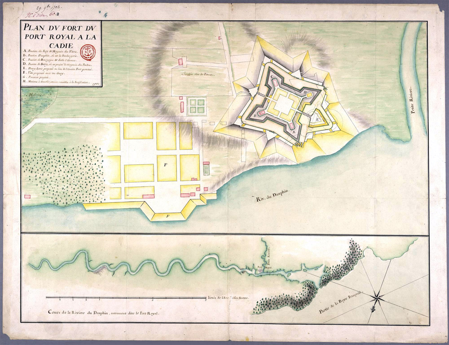 Fanciful, semi-historical musings aside, the French capital of Acadia was Port-Royal, on what is now Nova Scotia. Initially founded as a Scottish colony called Charles Fort in 1629, 'twas handed over to the French in 1632 thanks to the Treaty of Saint-Germain-en-Laye (1632), which had concluded the latest war betwixt Britain and France. The French renamed the settlement Port-Royal, and built themselves what appears to have been a very nice starfort to celebrate their acquisition.