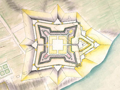 A sadly no-longer-extant starfort whose pedigree was impressive indeed: Port Royal's citadel in 1702. |