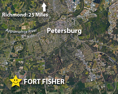 Eventually serving as the anchor to the "fish hook" of fortified line to the southwest of Petersburg, Fort Fisher was the largest of those fortifications. All told, the Union lines around Petersburg grew to a length of 32 miles, with 36 individual forts and 50 gun batteries sprinkled thereamongst.