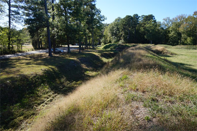 A reconstructed section of the infantry earthworks that surrounded Petersburg during the Civil War, at the excellent Petersburg Battlefield Eastern Front Driving Tour. Looks like a pleasant locale at which to conduct one's business for nine months, right? |