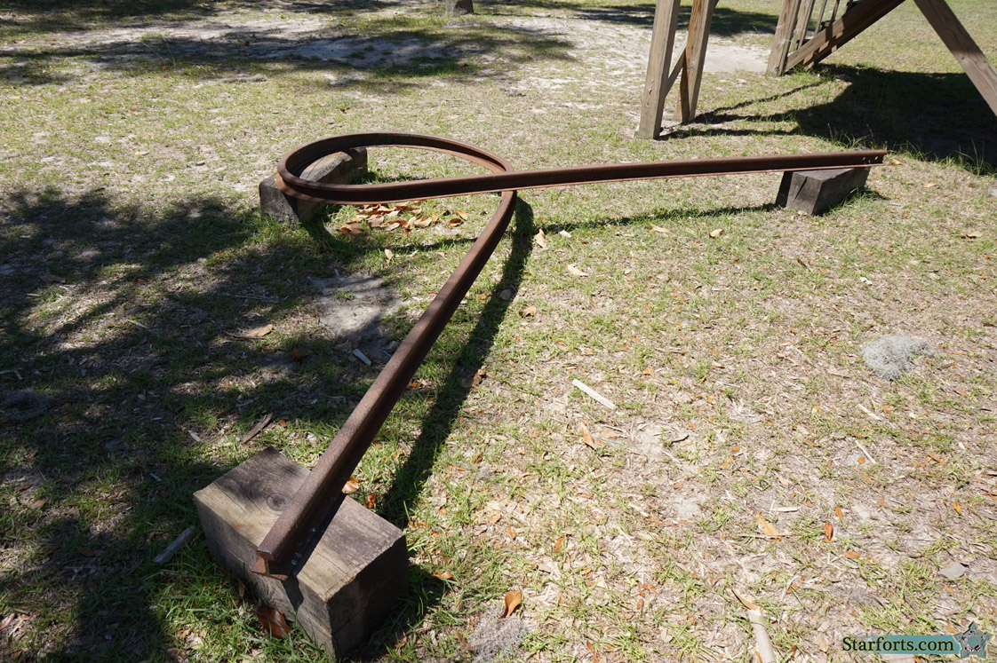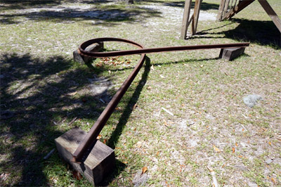 When Federal troops reached Confederate railroads, they frequently left these behind: Sherman's Bowties. Alternately known as Sherman's neckties and, more belaboredly, Old Mrs. Lincoln's Bobby Pins, these were rails that were heated, and then twisted around tree trunks or handy poles so as to render them difficult to use for railroading purposes. This example is on display at Fort McAllister in Richmond Hill, Georgia. |