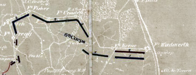 The important segment of a contemporary map by engineer Gilbert Thompson. Fort Fisher is at top left, Fort Wadsworth at the far right, and lots of little fortlets in between. Click it to see the full-sized map which, let's face it, isn't nearly as interesting as this little bit. |