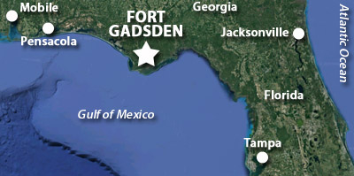 But the word figures prominently in the story of Fort Gadsden, so let's all say it together: Appa-latchi-cola! We can of course blame Native Americans for this word, as it was the name of a tribe which lived along a mighty river that flowed through what is today's Florida's panhandle. When white guys with parchment 'n' quill pens showed up to make the maps, they naturally named the river after the people who populated its banks. What's mostly exciting about the Apalachicola River today is that, if you drive over in from east to west, you're suddenly in the Central Time Zone, and you need to set your watch back an hour! Or forward an hour. Well, you definitely do one of those things.
