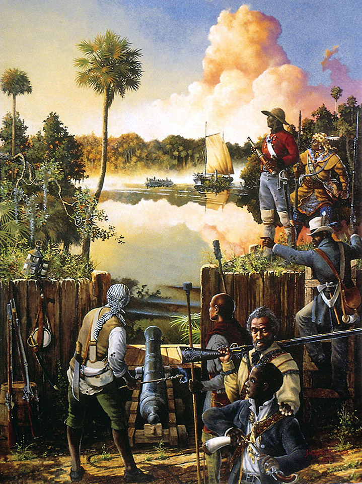 Warriors from Bondage by Jackson Walker, depicting the approach of the US Navy at Negro Fort on July 17, 1816. |