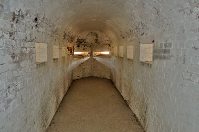 As one might expect, Fort Glanville was supported by a series of interior and exterior structures and tunnels. The two-floored barracks was studded with firing embrasures; There was a laboratory in the fort, where gun charges would be prepared. The caponniere was accessed via a tunnel with a dogleg, to mitigate notional blast damage.