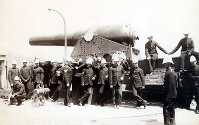 Circa 1882, a merry gun crew (the couple holding hands seems particularly carefree and gay) poses with their Armstrong 10" RML (Rifled Muzzle Loading) gun. Fort Glanville is unusual for Starforts.com in that photography existed when it was first built! |