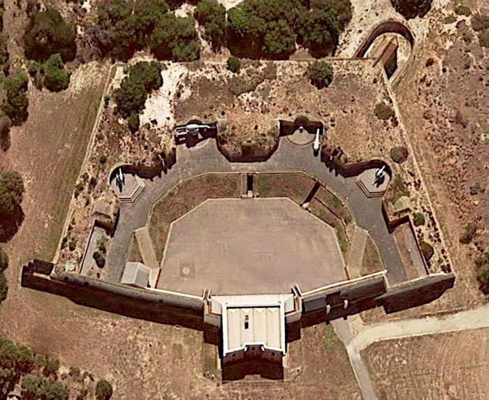Scratchley had served with the British Army in the Crimean War and Indian Mutiny of 1857. The Jervois-Scratchley Reports of 1877 detailed the need for several coastal fortifications, five of which were designed by Scratchley: Fort Glanville, Bare Island Fort in Botany Bay, Fort Scratchley in New South Wales, Fort Lytton in Brisbane and Fort Queenscliff in Victoria...click their names to see the forts, they're all batteries, like Fort Glanville...though arguably less forty than Fort Glanville. Which brings us headfirst into the unpleasant brick wall of truth that is, Fort Glanville is no starfort, but a defensible battery. In my eyes it certainly qualifies as a fort, as opposed to a battery, as it is an enclosed entity, with a caponniere in place to help defend it from infantry attack. Please address all starfort selection-related complaints to dontcare@starforts.com. |