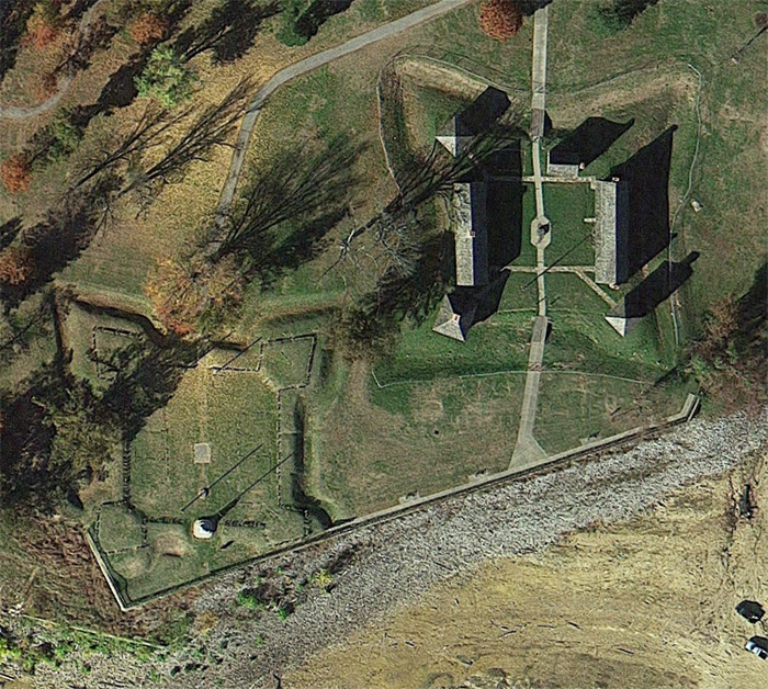 The more astute observers among us will have noted that there are two starforts at the top of this page. As tempting as it is to imagine that this represents a constellation of starforts, cleverly built for river defense, what we're seeing is the original Fort Massac to the lower left, and a replica of Fort Massac as it appeared in 1802. To the best of my knowledge, this replica-next-to-the-original scheme is unique in the world of starforts.