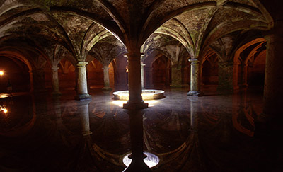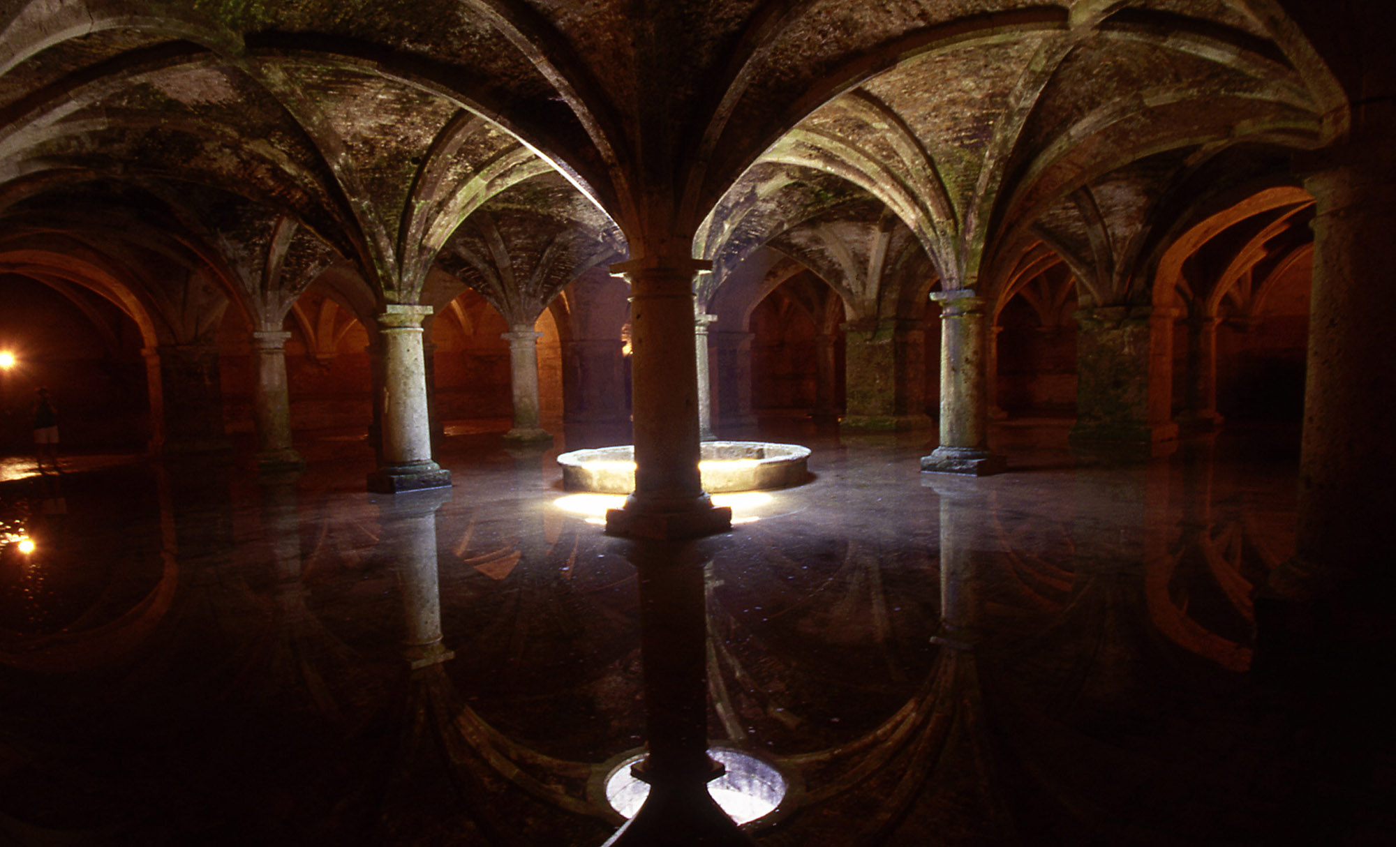 Mazagan's famous cistern, the Cysterna Fortecy. A shallow layer of water (from which I would not drink) makes for pleasing reflections indeed. This cistern is a 111-foot-wide square, held together with five rows of stone pillars. |