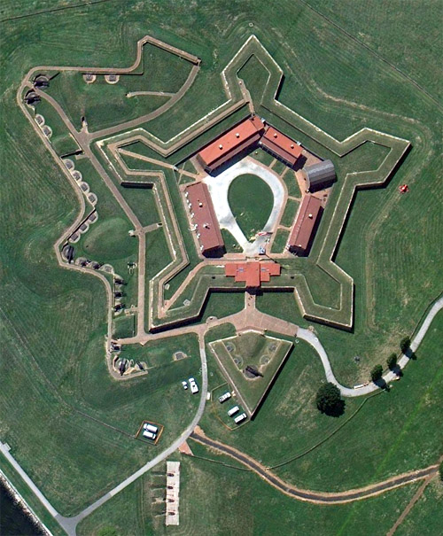 Baltimore has a harbor. By all accounts it's a pretty nice harbor, so naturally the British would have preferred the new USA not possess it. The first defensive structure was built at the current location of Fort McHenry in 1776. The little bit of land that juts out into the entrance of the harbor, then known as Whetstone Point, was developed as a defensive position from 1776 to 1783. The current Fort McHenry was built from 1794 to 1806, and in 1798 was named after James McHenry (1753-1816), a signer of the US Declaration of Independence and Secretary of War under Presidents George Washington (1732-1799) and John Adams (1735-1826). From 1807 to 1814 things were shuffled around some, and the fort was further strengthened. The War of 1812 (1812-1815) broke out in the year you might expect, given the war's name. Britain had been making life difficult for the new United States since the latter was victorious o'er the former in the American Revolutionary War (1775-1783), plus the US just may have had some ambitions regarding all that tantalizingly close Canadian land. Events such as the HMS Leopard firing upon, boarding and removing four British Navy deserters from the USS Chesapeake on June 22 1807, just off the coast of Norfolk, certainly didn't help matters. Though awfully busy with Napoleon (1769-1821) in Europe, Britain said oh all right we'll have a war if you want, and on July 12 1812, 2000 American troops crossed the Detroit River and invaded and occupied a Canadian town with the heroic name of Sandwich. By August, the Americans had retreated back across the river into Detroit, been followed by British, Canadian and Indian troops, and surrendered Detroit and much of the Michigan Territory. Brevet Lieutenant Colonel George Armistead (1780-1818) (uncle of Confederate General Lewis Armistead (1817-1863) who would die at the Battle of Gettysburg (July 1-3 1863)) was in command of Fort McHenry when, on September 13 1814, the Royal Navy began bombarding the fort in hopes of silencing its guns and having free reign over Baltimore. The American defenders' cannon had less range than the British, but the Royal Navy, firing from extreme range to stay out of the American arc of fire, proved unable to hit much of anything important. The bombardment lasted 25 hours and, though pretty ineffective on both sides, was spectacular and great fun to watch, since all of Baltimore's lights had been doused for the occasion: Just ask Francis Scott Key, whose observation of the event inspired his composition of the poem that became the Star Spangled Banner, the US national anthem. Particularly noted in his poem is "the rockets red glare," referring to the British affectation of using pretty, noisy yet wildly innacurate rockets against their enemies. Armistead was painfully aware that Fort McHenry's powder magazine was very vulnerable to mortar fire, which the British were also dropping on his position. One shell actually penetrated into the powder magazine, but for whatever reason failed to explode. Fort McHenry withstood the British naval onslaught, losing only four men: The British gave up and sailed away on the morning of September 14. During the US Civil War (1861-1865) Fort McHenry was used as a prison for both Confederate prisoners of war and many Marylanders who were suspected of Confederate sympathies. Among these devious wretches were Baltimore's Mayor, the entire city council, the police commissioner and, ironically, Francis Scott Key's grandson! More of Fort McHenry's guns were pointed towards the city of Baltimore than towards the water...Baltimore was thought to be just a spark away from complete insurrection against the Union for most of the war. Fort McHenry was massively built up during the First World War (1914-1918) to be used as a hospital for wounded US troops heading home from Europe. The Second World War (1939-1945) pulled the fort back out of retirement to be used as a Coast Guard station, to defend the Chesapeake Bay from the wicked Germans. Fort McHenry was designated a National Park in 1925. In 1939 authorities decided National Park wasn't good enough, so 'twas redesignated as a National Monument and Historic Shrine. In 1959, the first US flag made with 49 stars (thanks, Alaska!) was flown o'er Fort McHenry, and the first 50-star flag was flown over the fort in 1960. The actual flag that flew over Fort McHenry during that fateful bombardment in 1814 is currently on display at the National Museum of American History in Washington DC. It is in extremely fragile condition, and viewable in a darkened room where it is displayed at a comforting, relaxed angle. Fort McHenry is one of the eastern US' major tourist attractions. I visited the fort in 2012, won't you please visit my Fort McHenry Page in this site's Starforts I've Visited section? |