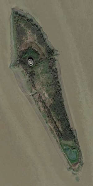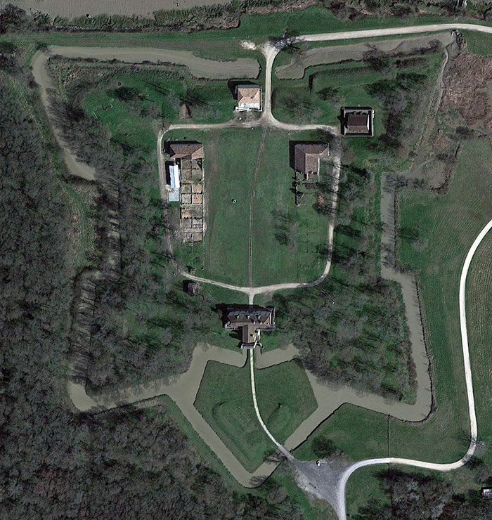 Fort Pâté on Île du Pâté in the Gironde River. Too many accents over too few letters. This tiny fortlet had to be built atop a sandbar, and was held in place with a system of timber pilings. |