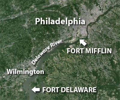An amazing amalgamation of wood, stone and chain nastiness was built into the Delaware from Fort Mifflin to Fort Mercer in New Jersey, effectively closing the river to anyone who didn't know the secret locations of its few gaps.
