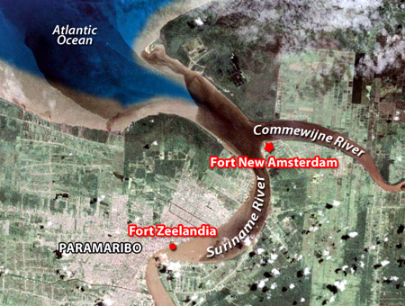 That better spot was at the confluence of the Suriname River and Commewijne River, not far from the Atlantic Ocean...which is where Fort New Amsterdam would be built. |
