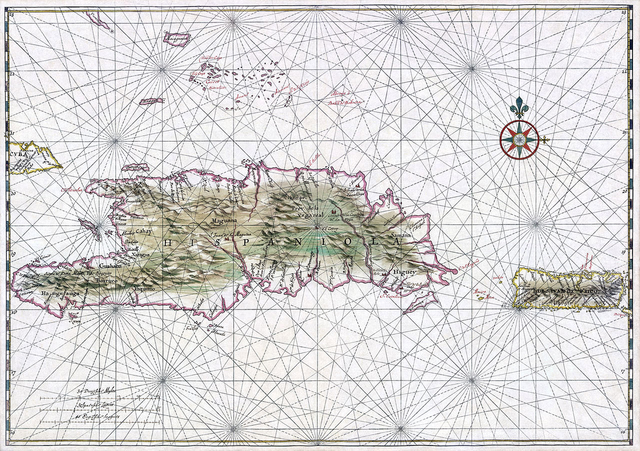 One of the first maps of Hispaniola and its neighbor Puerto Rico, from 1639 or thereabouts, cartographized by Dutchman Johannes Vingboons (1617-1670). |