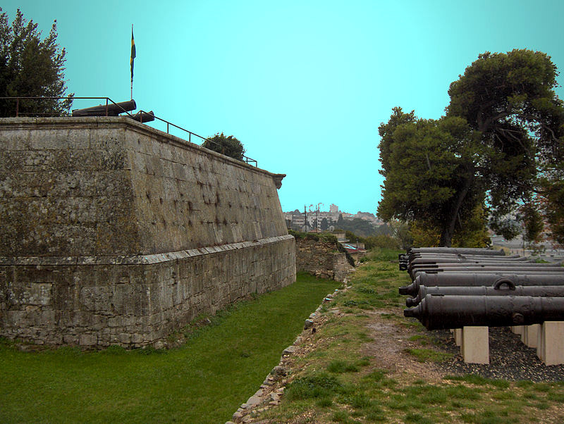 A collection of guns of the many nations that have armed Pula Fortress over 700 years, beneath an unnaturally blue sky. |