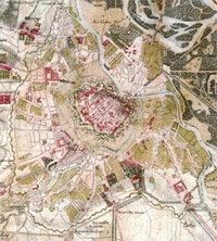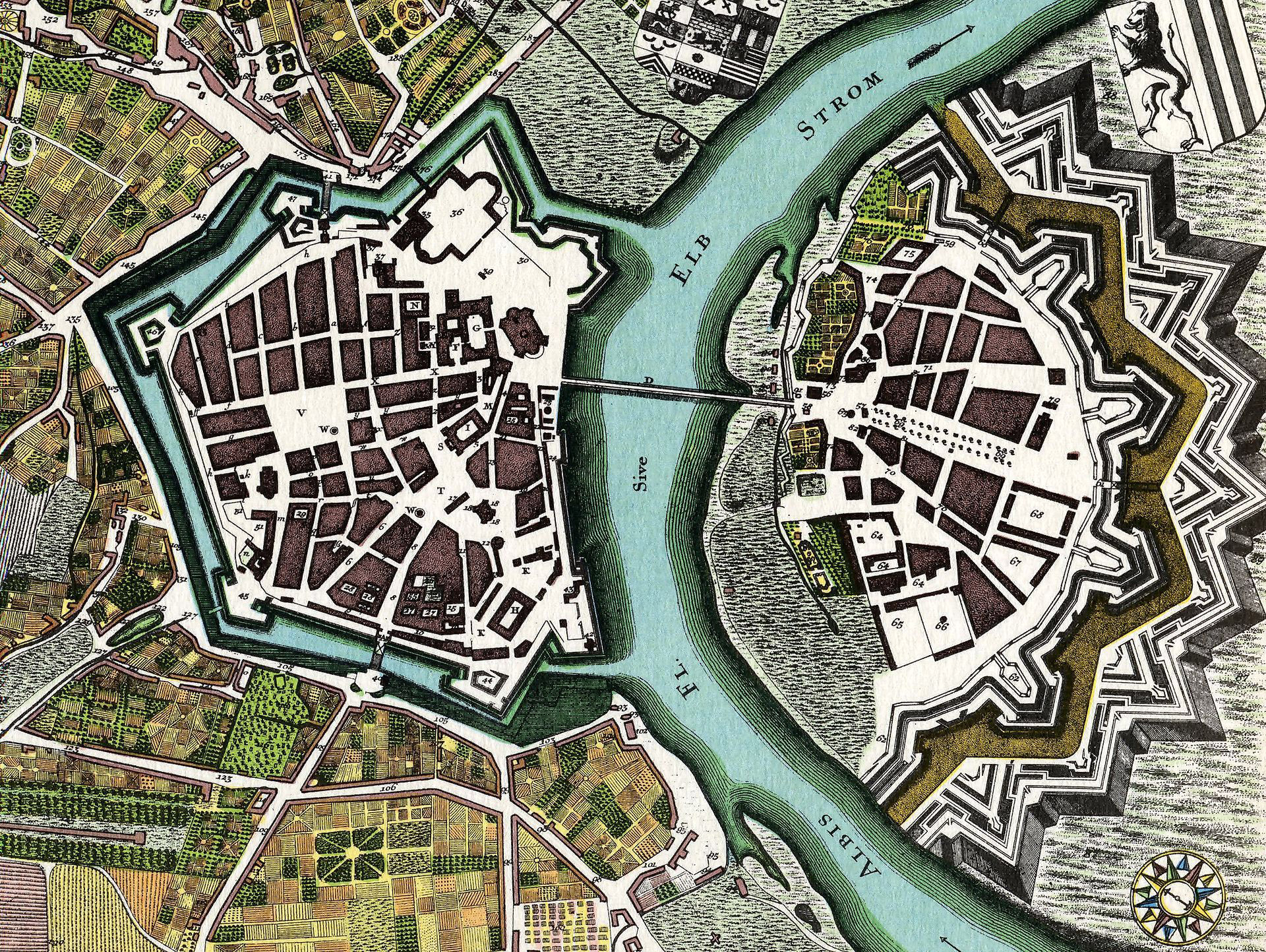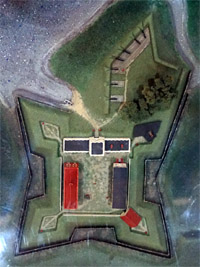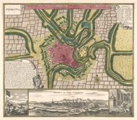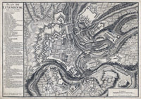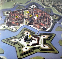 Maurice was known as a military innovator, and a firm believer in the utility of the modern starfort. His breathtaking example of the Dutch style of starfortification was built at Moers at the very start of the 17th century. Moers became Prussian at the beginning of the 18th century, and was briefly occupied by the French during the Seven Years' War (1756-1763)...after which Prussia's Emperor, Frederick the Great (1712-1786) ordered that Moers' lovely Dutch starfort be destroyed, perhaps due to its proximity to France. The city's pretty starry walls survived this strategic slight because they were needed as a dike to keep the city above water. |
