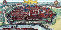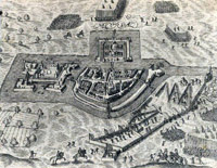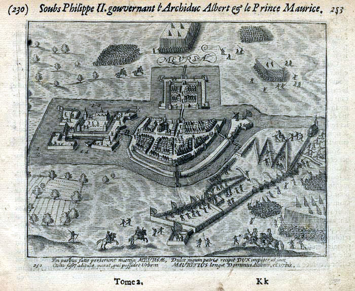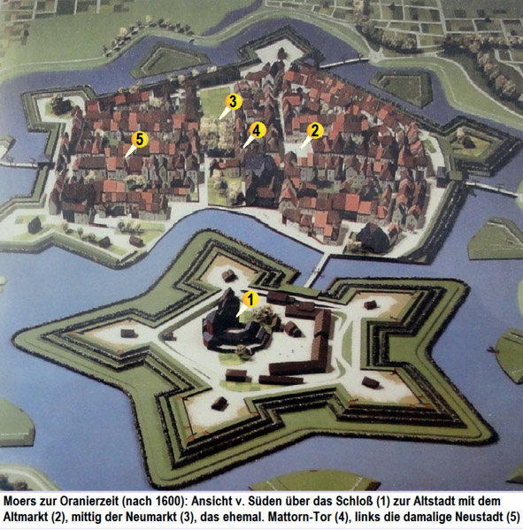 The Eighty Years' War (1568-1648) brought the Spanish, English and the "Oranges" (Dutch) To Moers: Spain held the town and built a lovely four-pointed starfort and outerworks, but the Siege of Moers (1597) won town and fort for Maurice of Orange (1564-1625). |