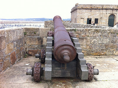 A gun at the Castillo de San Antón. Beware, Sir Francis Drake: We will run over your foot with one of these fashionably studded wheels! |