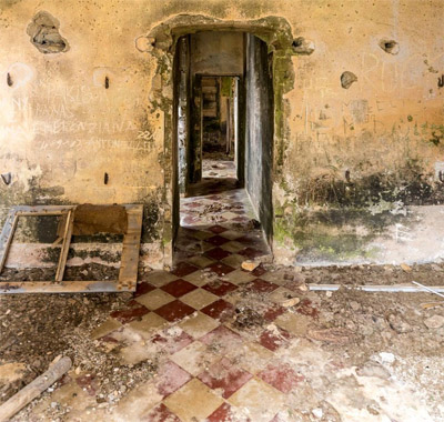 The Castello San Giacomo today, looking particularly sinister. Photograph by Bebo Cammarata and/or Renato Pantaleo, from a 2013 exhibit in Favignana that illustrated the evil, decrepit state of the facility. |