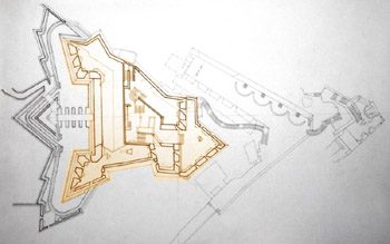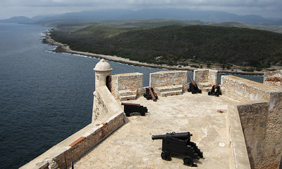 Santiago de Cuba, founded in 1514 and Cuba's colonial capital city at the time of the Armada's vanquishment, had already been plundered by the French in 1533. A squeaky little fortification was built from 1590 to 1610 in the location where the Castillo of our intertest now stands, as protection from pirates and other scalliwags, but plans for something substantial didn't begin until 1639.