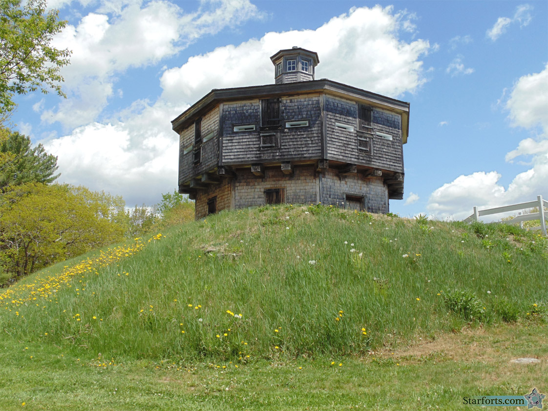 But in this case, they chose to build a circular, masonry battery of fifteen guns and one mortar, with a blockhouse behind it. This particular form of blockhouse, an example of which can be seen to the left, was very popular in New England during the period in question: Cheaper to make than a masonry fort, these blockhouses were painted white for a high degree of visibility...which is anathema to the concept of the American starfort, for the most part, but these fortifications were meant to be seen, as undeniable evidence that the area was DEFENDED.