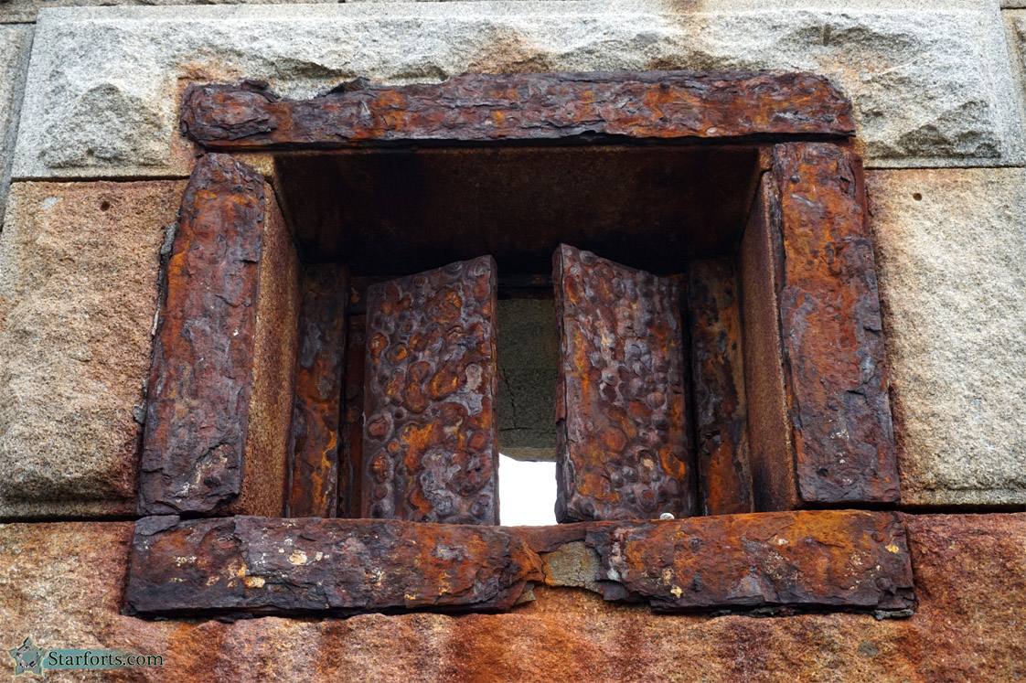 Fort Preble's heroic, if unfinished, southeast wall. Swinging iron shutters, designed by Joseph Totten, graced the firing embrasures of all American seacoast defenses that operated in the mid-19th century. There is evidence of these shutters in a great many places, but seldom does one see both shutters in place, if rusted unswingable. These are at Fort Preble, and seeing them in place got me much more excited than it reasonably should have. |