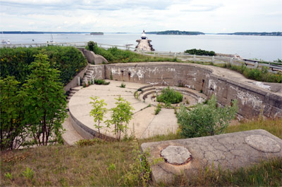 One of Battery Rivardi's two 6-inch disappearing gun emplacements at Fort Preble. Also featured is the Spring Point Ledge Lighthouse and Fort Gorges, which we couldn't get away from even if we wanted to, which we do not. |