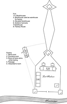 A lesser-known expedition was that of Lieutenant Zebulon Pike (1779-1813), who in 1805 was ordered to search for the source of the Mississippi River, and/or cool places to put forts. Zeb & co. found that the confluence of the St. Peters (later named the Minnesota) and Mississippi Rivers would be an extremely cool place to put a fort, and convinced the local Dakota Indians to sell the United States a nine-square-mile plot overlooking that confluence, for the princely sum of $2,000. This agreement was called the Treaty of St. Peters, but is better known as Pike's Purchase. Zebulon went on to have an interesting life, culminating in 1813 when he was killed by an exploding starfort ( Fort York) during the War of 1812 (1812-1815)...just about as interesting a method of dying that I can think of. Fort Pike, protecting New Orleans from a waterborne approach via Lake Pontchartrain, was later named in his honor. The United States' new property where the Mississippi met the St. Peters wasn't immediately utilized, but something had to be done to protect the United States' (commercial, fur) interests along the Mississippi ASAP, and thus the weird-looking thing to the left was born. Fort Madison, named for US Secretary of State and later President James Madison (1751-1836), was built in 1809 at what is today the lower right corner of Iowa, and was for a time the northernmost American fortification on what was then known as the "Upper Mississippi." |