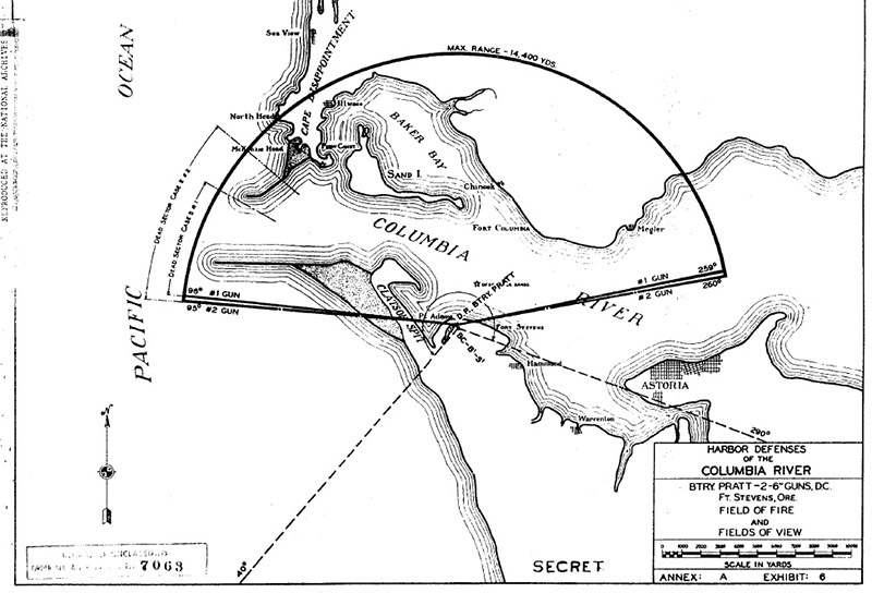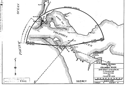 The field of fire of the two 6" disappearing guns of Fort Stevens' Battery Pratt. A range of 8 miles was impressive for 1897, but dangerously obsolete by the start of the Second World War. |
