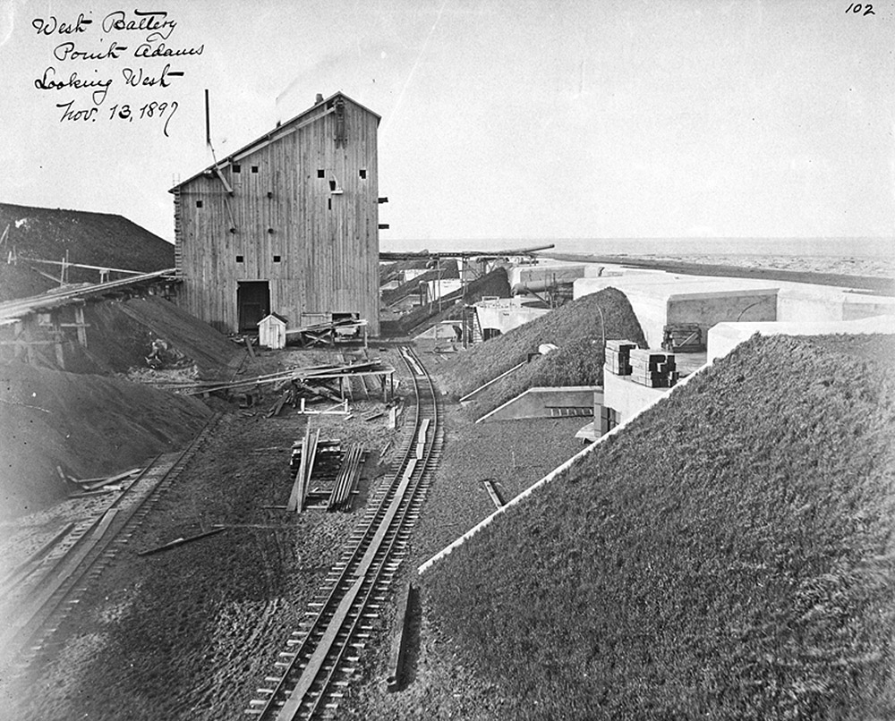 Fort Stevens' West Battery (soonafter renamed Batteries Mishler, Walker and Lewis), under construction in 1897. At least I hope it was still under construction, and that huge obnoxious wooden structure behind the battery was temporary. Because these Endicott Period batteries were supposed to be difficult for attacking ships to identify, and that big dumb wooden thing sure seems as though it would be easy to see for miles around. |