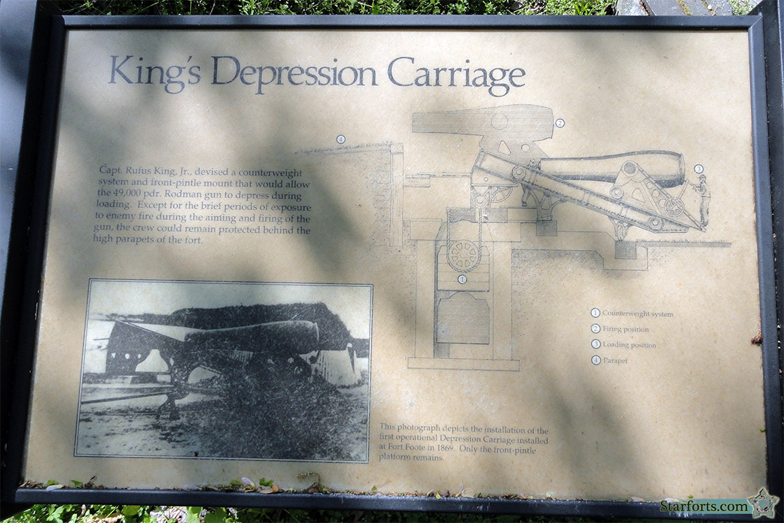 Intended to lower the gun after firing, where it could then be reloaded without exposing its gun crew to return fire, these carriages worked much better for breechloading cannon than muzzleloaders...and the US arsenal was popping at the seams with muzzleloading Rodman Guns (over 1800 had been manufactured during the Civil War, and few had been used in action). The King's Depressing Carriage was not adopted by the US military, and not installed at Fort Sumter.