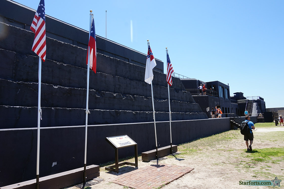 Battery Huger today, with the four flags flown over Fort Sumter during the Civil War: The Garrison Flag, a 33-star US flag; the First National, the first flag of the Confederacy; the Second National, which replaced the first in 1863; and the 35-star US flag, raised over Fort Sumter in 1865. |