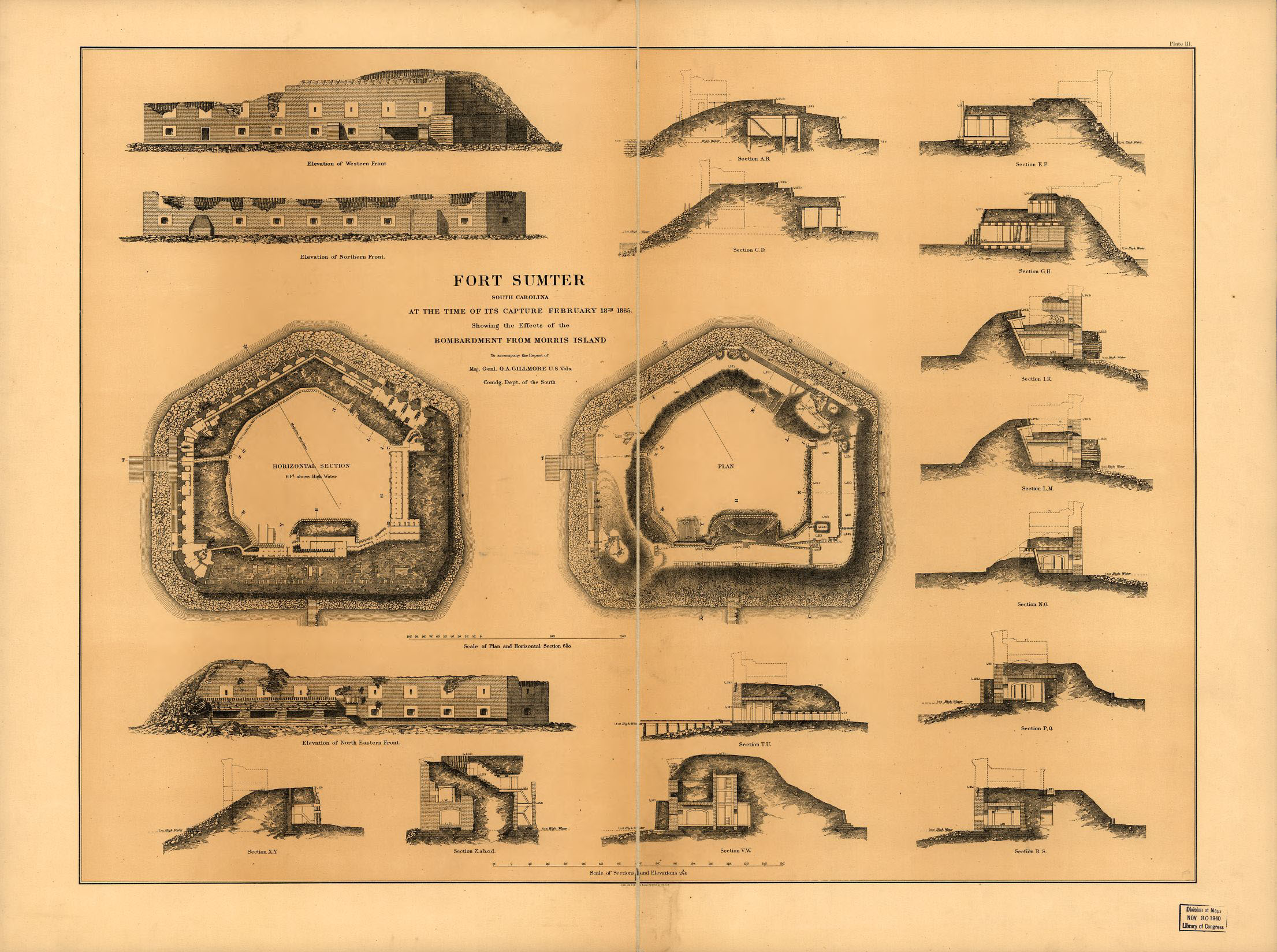 The sorry state of Fort Sumter upon its eventual recapture by the Union is cataloged in loving detail in this 1865 drawing. Thanks again, Library of Congress! |