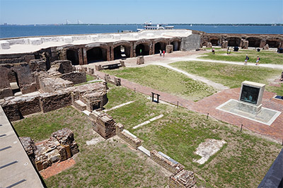 What's left of Fort Sumter's parade ground, from Battery Huger. On the right is a 1932 monument presenting the names of Fort Sumter's Union defenders in 1861. |