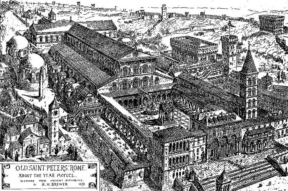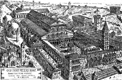 The original St. Peter's Basilica, "about the year MCCCCL," which would be 1450 for those of us who don't speak Roman. There's that Vatican Obelisk, ever-present, center left! |