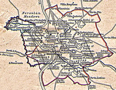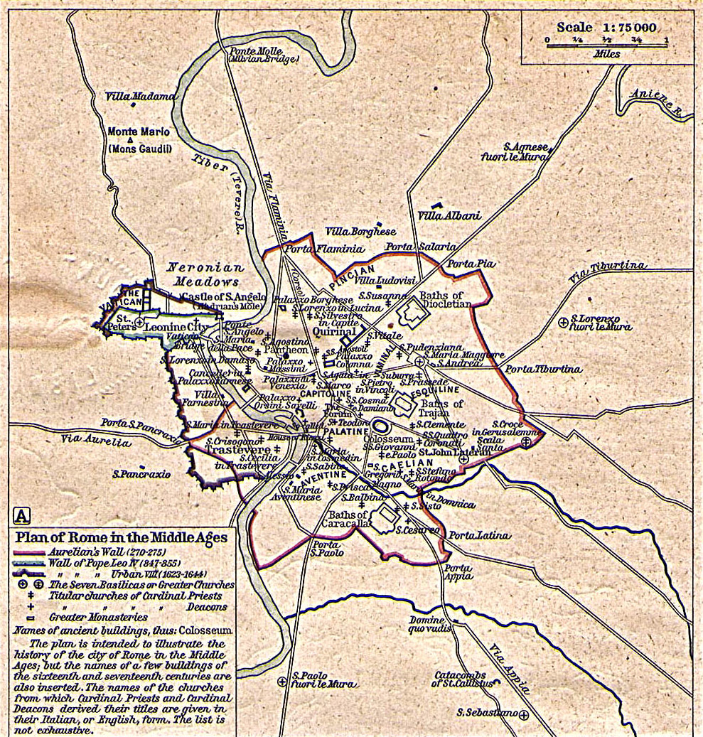 Rome's medieval walls, as presented in a 1923 map. The walled Vatican, or Leonine City as it was initially known, is visible dangling out there at the upper left. |